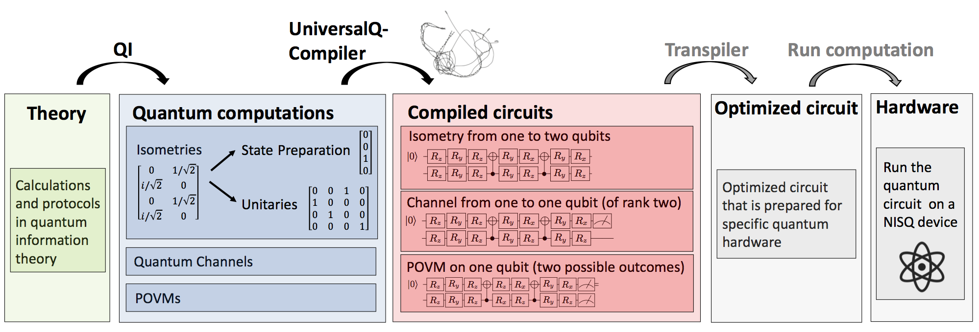 The diagram below indicates how QI and UniversalQCompiler can be used to analyse quantum information protocols for running on some quantum hardware: